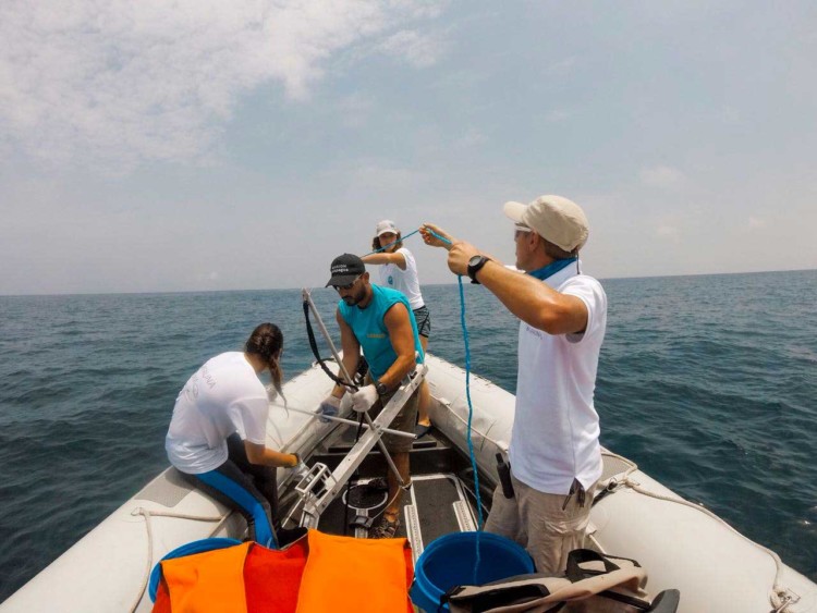 Today the Megafauna team set baited cameras. These rest at 10 meters under the surface with a small cage of bait and 2 GoPro cameras attached. There are 5 sets of baited cameras strung together with line with 200 meters distance between each. The team chooses a location to set the cameras, works together to deploy them in the water and record the time and coordinates, and waits as the cameras collect footage for between 2 and 3 hours. After recovering the equipment, the team reviews the footage (that’s 10 cameras with 2-3 hours of footage each!) and records the findings. They take screen shots and video clips which help them identify which species exist here and their abundance and social interactions.